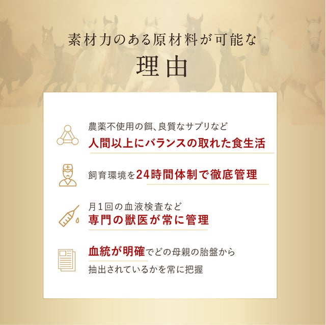 1頭あたり数億円の価値にもなると言われるサラブレッドを育てる徹底した管理体制のもと育った馬の胎盤はまさに別格です。