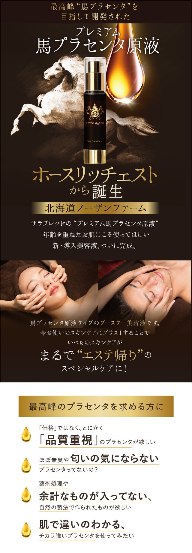 ホースリッチェストの「プレミアム馬プラセンタ原液」は使い続けていただくことで、よりご自身の肌で効果を実感していただきやすい商品です。 購入していただいた後は、洗顔後にまずは毎日1か月使い続けていただければと思います。 ・製造工程上の都合や配送作業に伴う止むを得ない事情によりお届けが遅れる場合がございます。 ・開発中の製品につき、デザイン・仕様が一部変更になる場合がございます。 ・不良品以外の使用感等に関する返品・返金はお受けいたしかねます。 ・本商品がお肌に合わないときはご使用をお止めください。また、それでも症状が治らない場合は医療機関へご相談ください。 最後に、今回応援してくださった皆様に喜んでいただき、そしていつまでも若々しく素敵な生活を送れるよう、精一杯、「プレミアム馬プラセンタ原液」を提供できるようスタッフ一同進んでいきますのでよろしくお願いいたします。