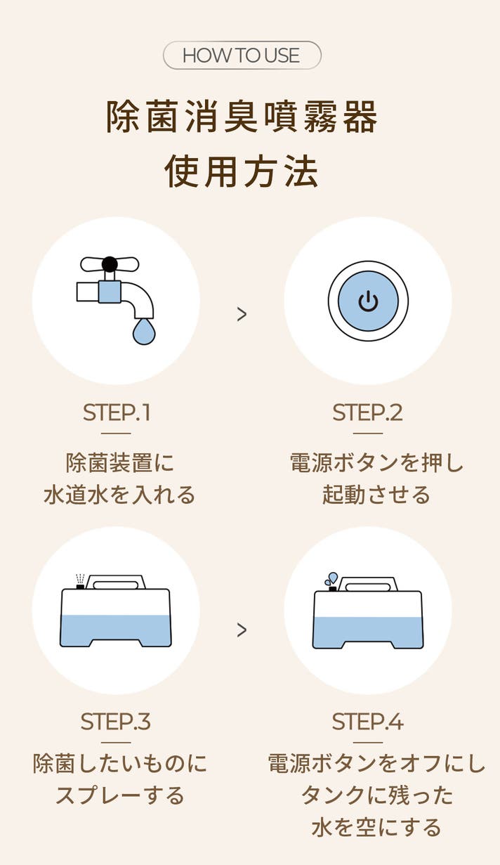 追加でさらに噴霧する場合は、一度噴霧をやめて約10分~15分ほどあけてからご利用をお勧めします。