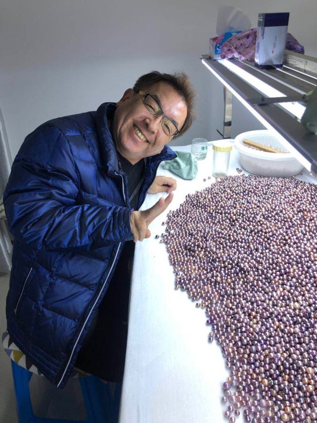 彼らは集めた天然真珠をふるいにかけ、サイズを分け、
