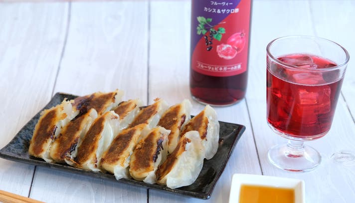 餃子のジューシーな旨味、焦げの香ばしさに、Fru:Vie(フルーヴィ―) カシス&ザクロ酢の果実由来の酸味とザクロ酢の酸味が相性抜群です。