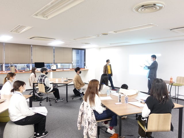 (↑今年3月、対面でのイベントを実施いたしました。愛知の優良企業の社長が学生に各業界の仕組みや企業の商流をお話下さるイベント「シャショク」に取り組んでいる様子です。)