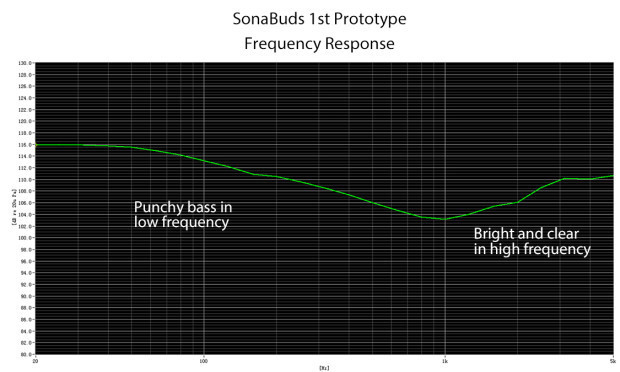 Sonabudsは、この低音の不足を補うために、低音補強して迫力ある低音を実現しています。下のグラフはSonabudsのその周波数特性を示すグラフで、左側の低音域に力強さがあることがわかります。