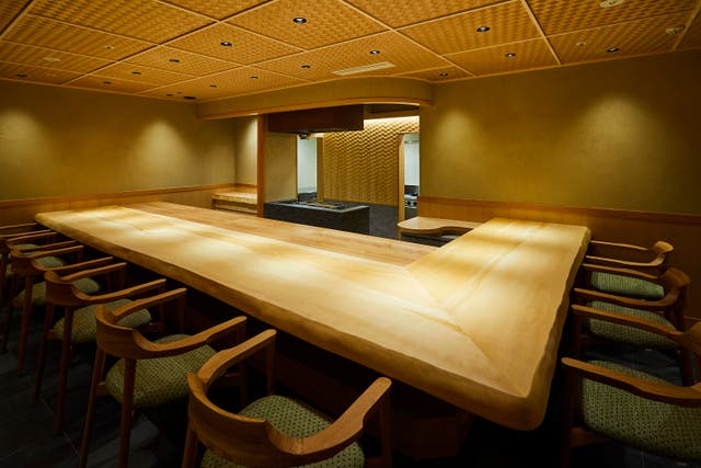 お店の目印はこれだけ。予約者のみに知らされる秘密の扉の奥に繰り広げられるのはカウンター9席だけという贅沢な和空間である
