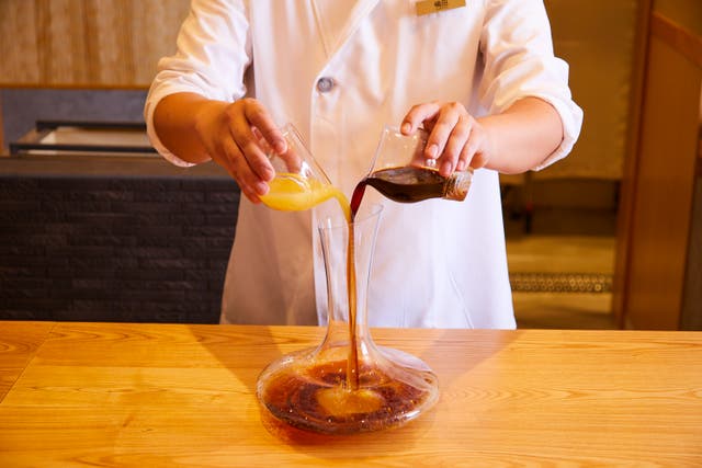 ふぐと言えばやはりポン酢。こちらでは絞りたての柑橘と醤油だれを目の前で合わせて仕上げる出来立ての一番ポン酢のショーから開演となる。