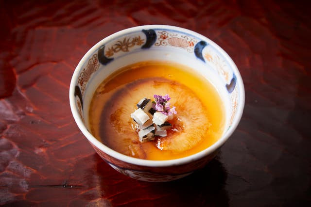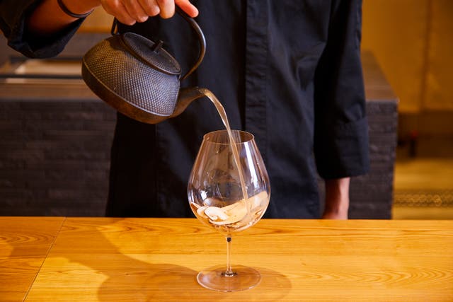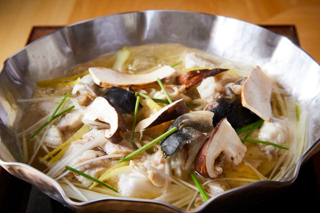 1年で2週間のみふぐと松茸が出会う希少なタイミングには、松茸とふぐのコンソメを味わう事ができる。芳醇なフグの香り・濃厚な旨味がこれでもかと押し寄せてくる。