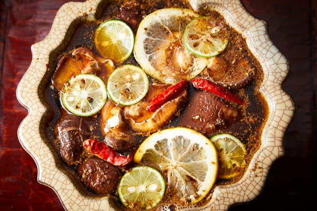 ふぐの骨から抽出したオリジナルのつけダレに入れた骨付きカルビは悶絶の美味さ