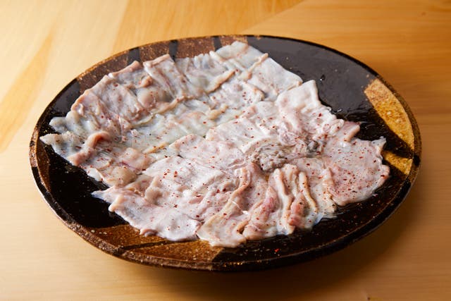 器は江戸中期の骨董の古伊万里に盛り付けられる。通常の3倍の厚みに切り付けられたてっさは重量級の食べ応えである
