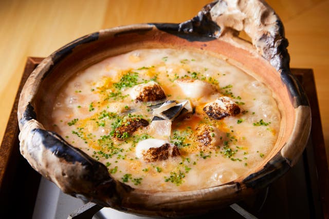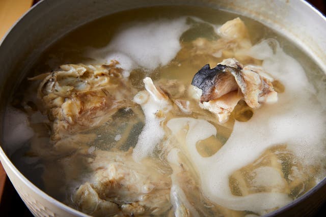 てっちりはふぐの中骨やあらを煮出した極上のスープで炊き上がられる。カウンターで職人が1つずつ仕上げてくれるので、こちらは会話に集中できる。