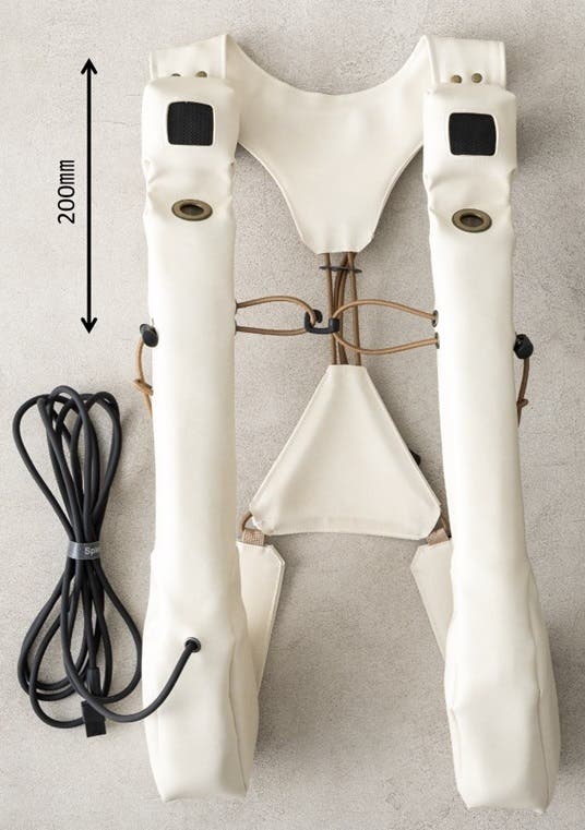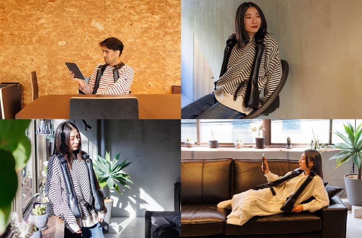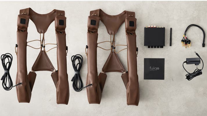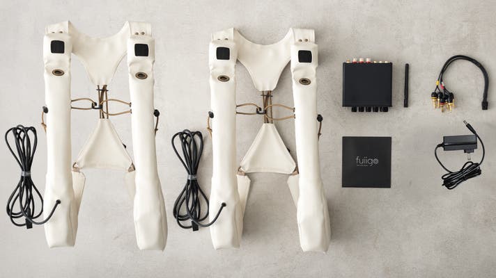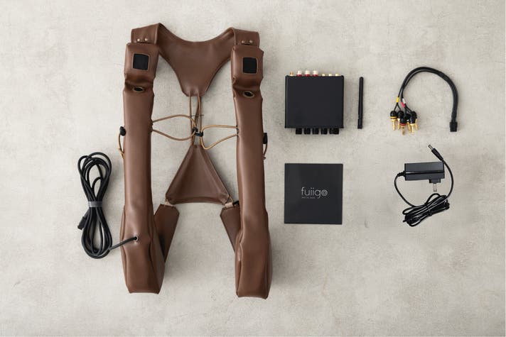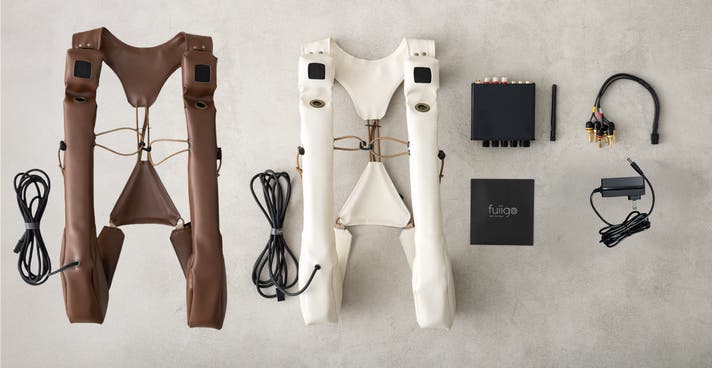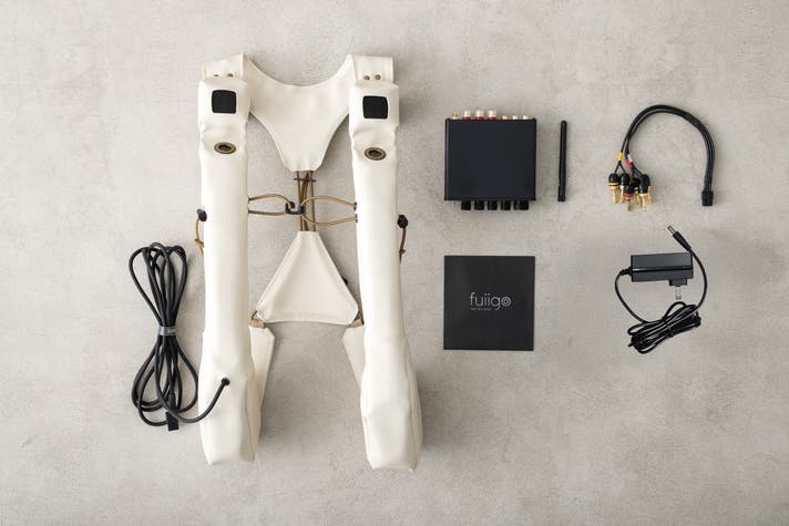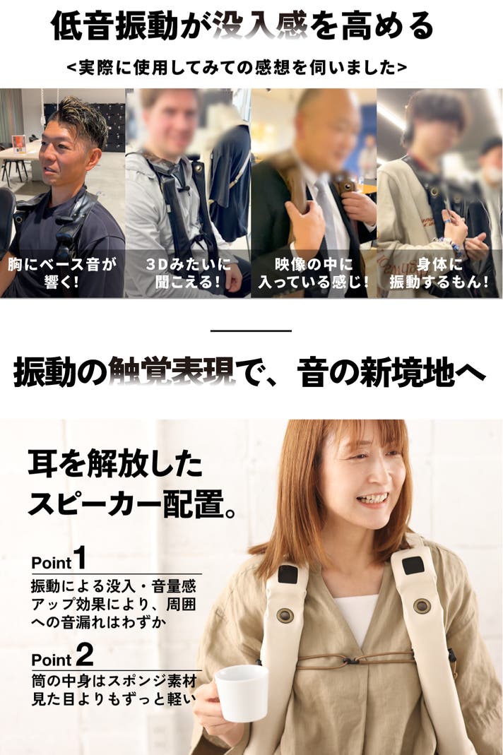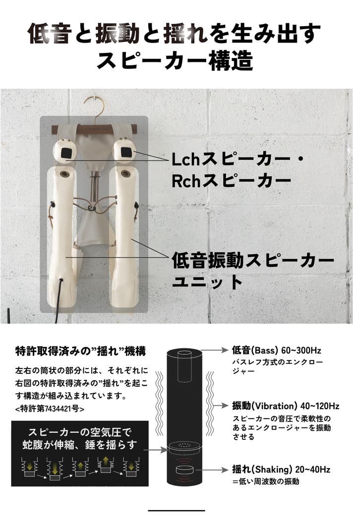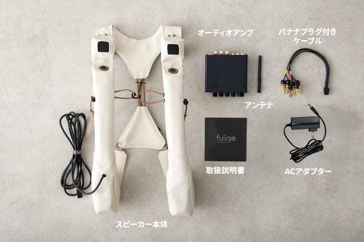 fuiigoは身に着けて使用するスピーカー(ウェアラブルスピーカー)で、音を耳で聴くだけでなく、重低音と同時に、振動と揺れを生成し、それを聴く人の体に自然に伝達する仕組みを搭載していることにあります。更に、スピーカーの配置によって醸し出される「音に包まれる感覚」との相乗効果により、大きな臨場感や没入感を生み出しているのです。