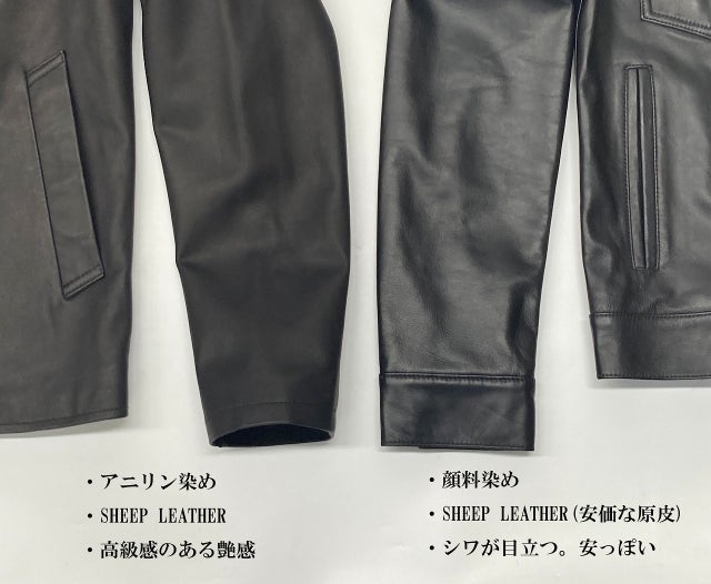 ※今回のアニリン染めレザーJKと顔料染めレザーJKを並べています。