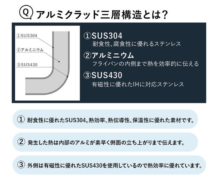 これまでの「アルミクラッド三層」シリーズと同じく熱効率、熱伝導に優れた特殊ステンレス“アルミクラッド三層鋼”を使用しているため熱ムラが少なく均等に火の通るフライパンになっています。