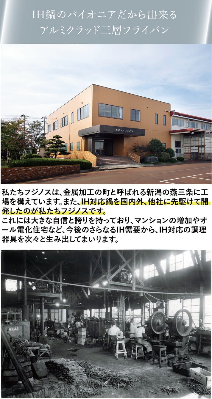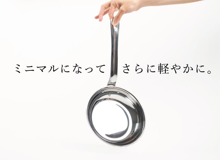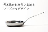 1985年に開発したIHクッキングヒーター対応の業務用鍋の経験と技術を活かし、材質や板厚、デザインなどの試行錯誤を重ねて『気軽に本格調理が楽しめる無駄をそぎ落としたシンプルなフライパン』です。