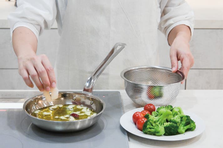 オリーブオイルにスライスニンニクを入れて、お好みで唐辛子を入れてください。塩やコンソメなどで味付けをしたら火にかけます。