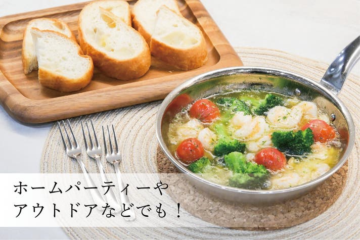 スキレットを買うほどではないから、普通のサイズのフライパンで作るけどあまり美味しくできないアヒージョ。そんなアヒージョもアルミクラッド3層フライパンの18cmならちょうどよくて簡単!