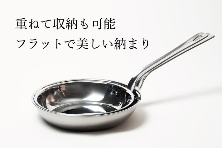 フライパン本体のラインに無理のない自然な調和を持たせ、余計な装飾を省いたフラットでミニマルなデザインに仕上げました。使いやすさに加え、2サイズがすっきりと重なる設計は見た目も収納も美しく整います。