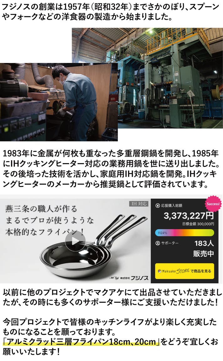 ぜひ手に取って実感していただけたらと思います。「アルミクラッド三層フライパン」18cm/20cmの応援購入のほどよろしくお願い致します。