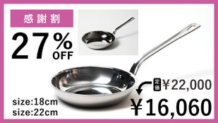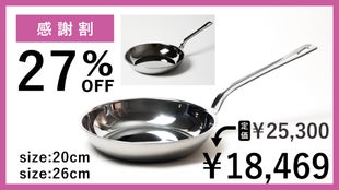 前回大好評だった「アルミクラッド三層」シリーズの「アルミクラッド三層フライパン」22cm/24cm/26cmの3サイズに続き、今回18cm/20cmの2サイズが新しく誕生!