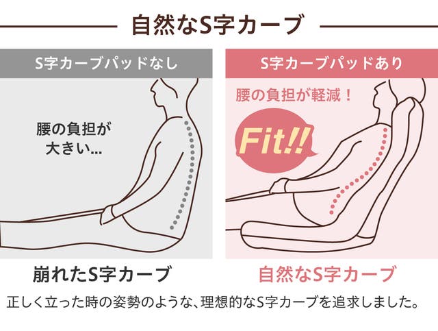 - 大学との共同研究により開発した、特許取得「S字カーブパッド」で理想的な座り心地に。