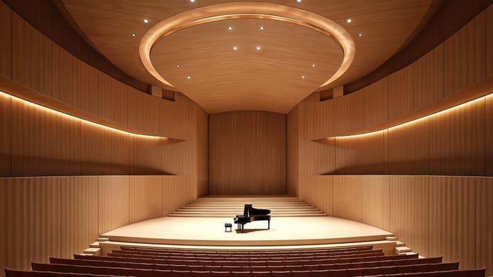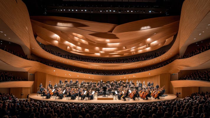 コンサートホールの豊かな響きは、直接音に加え、天井・壁・背面の反響板で生まれる反射音が重なって生まれます。