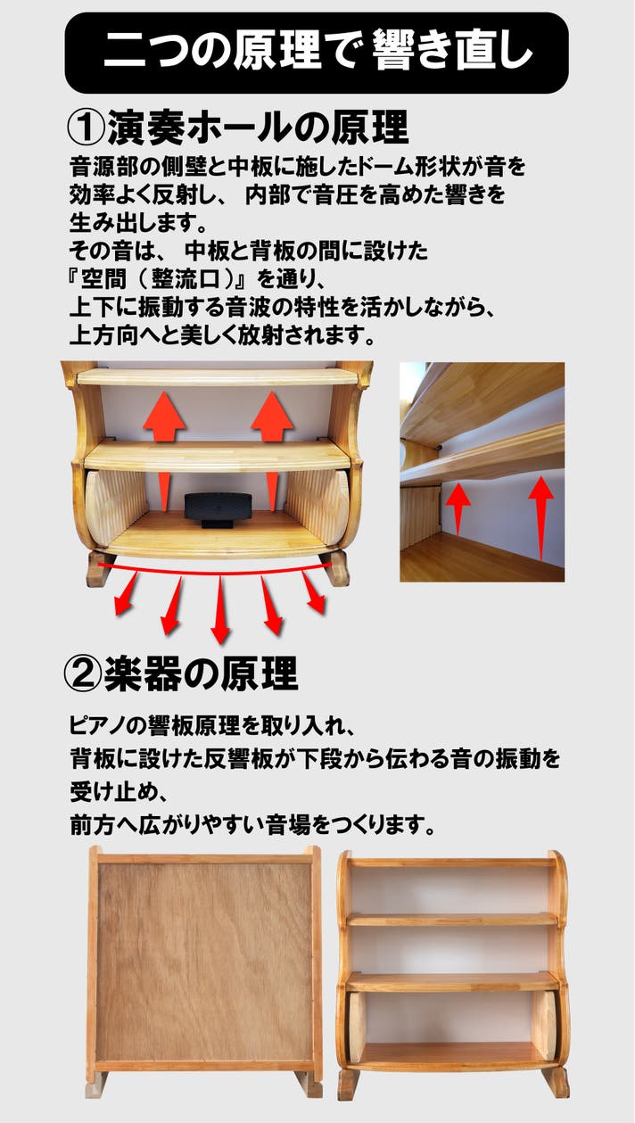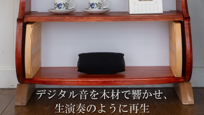 高価なオーディオ機材に頼らなくても、家具そのものが音を響かせ、空間に臨場感を生み出す——。その仕組みを追求し続けた結果、この音響家具が誕生しました。