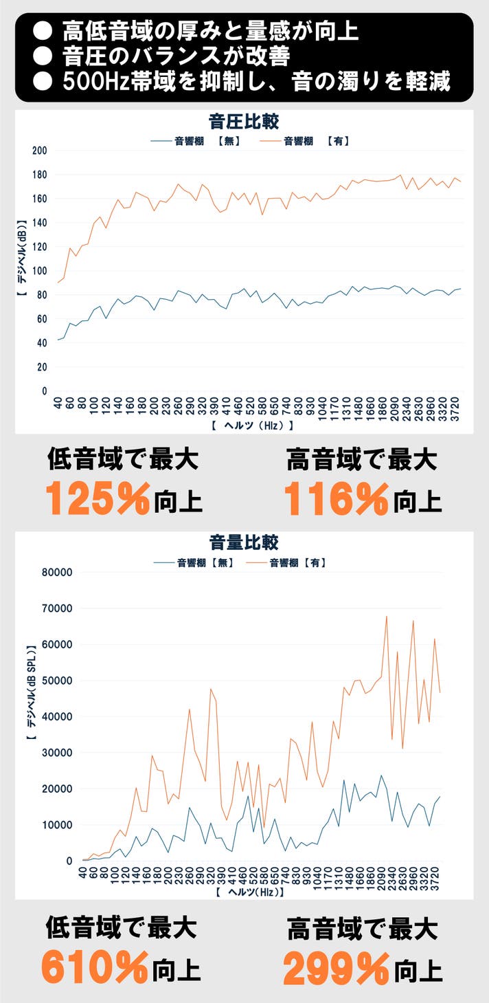 注目すべきは、単なる音量の変化ではなく、音そのものの厚みと立体感が増した点です。これは、音響家具内部で音が反射・増幅される過程で、スピーカー単体では感じにくい倍音成分が空間に現れるためです。