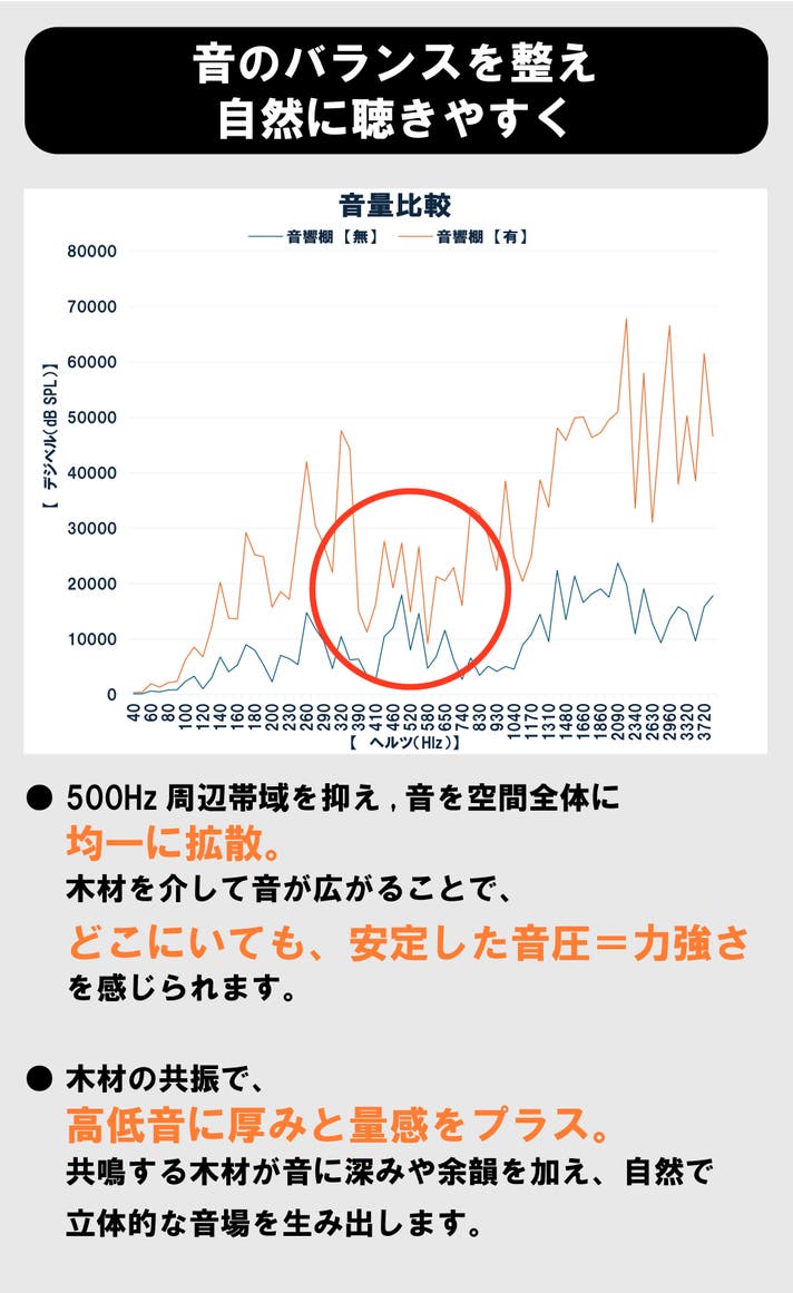 内部で音が反射・増幅され、天然木材が共鳴することで、