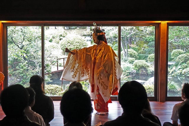 能舞台を飛び出し、日本庭園を背景に舞う姿は当イベントだけ。能楽堂では実現できないような、1m~の至近距離での鑑賞やライブ感・迫力のある身近な能公演を、宿坊ならではの雰囲気の中で行います。