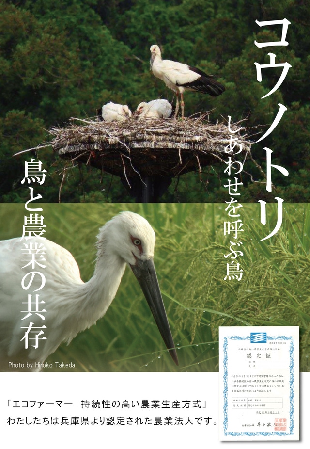 絶滅危惧種に指定されている、しあわせを呼ぶ鳥「コウノトリ」と共存できる農法で人と自然にもやさしいお米づくりを追求しています。地球・動物・人が共存共栄できる社会を目指していきます。