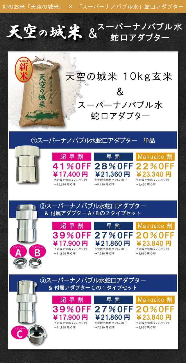 【Makuake割】天空の城米( 10kg玄米 )&(3)スーパーナノバブル蛇口アダプター +付属アダプターCタイプセット