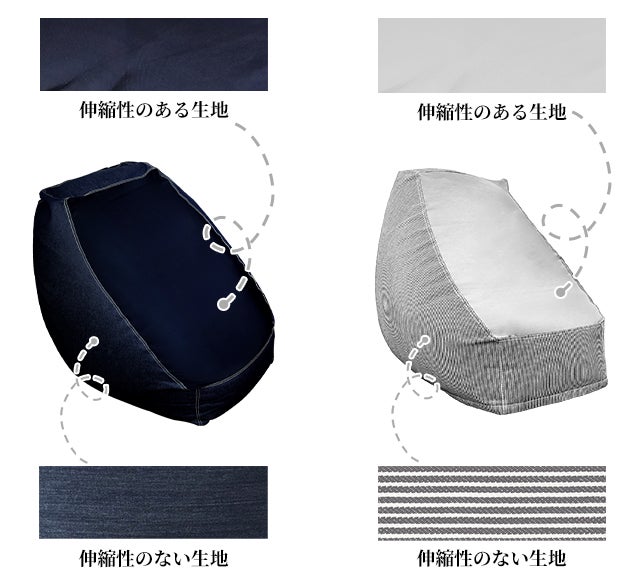 【伸縮性のある生地】もっちりとした感触が特徴です。伸縮性に優れ、中材の極小ビーズと合わせてやさしく体を支えてくれます。