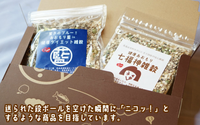 せっかく送って喜んでもらうためには「美味しい雑穀米」を開発しなくちゃ!ということで、いろいろな青森県の原材料を試して試行錯誤して完成したのが「あおもり七福神雑穀」でした。