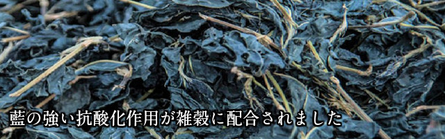 青森県栽培の藍を活用しています。藍の持つ特性は豊富なポリフェノール、高い抗酸化作用、コレステロールの低減作用も期待できます。要するにアンチエイジング効果を期待できます。また胃腸炎などの炎症系の病気にも効くとのことで薬の無い昔から利用されていました。