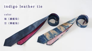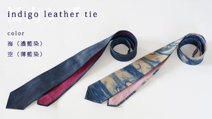 自社開発した藍染の牛革「福山レザー」を使ったこのネクタイは