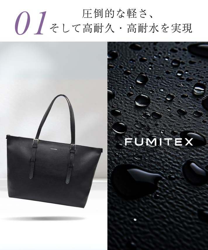 ビジネスバッグ用に最適化したFUMIKODAオリジナルの生地は、本革を凌駕する質感ながら、軽さや耐久性、耐水性も実現しています。