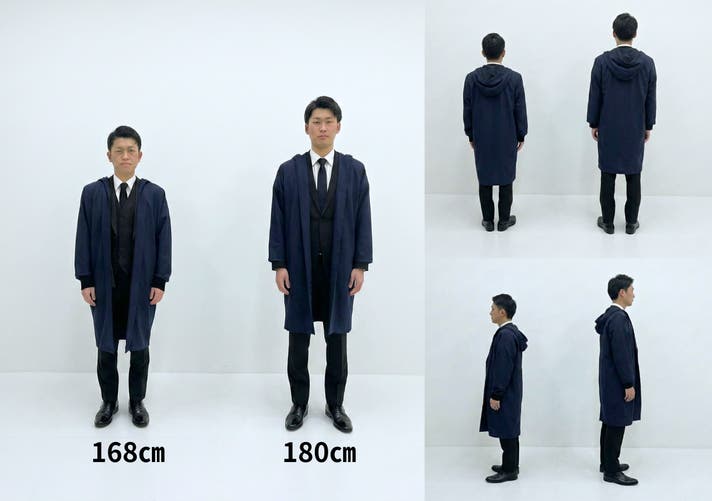 A.基本的には、フリーサイズで和装由来のゆったりとしたシルエットで作られています。肩幅や身幅を、選ばないデザインですので、厚手のニットや、ジャケットの上からでも窮屈感なく羽織っていただけます。長さについてはショート・ロングの2種類からお選びいただけます。(着用例を参考にご覧ください)