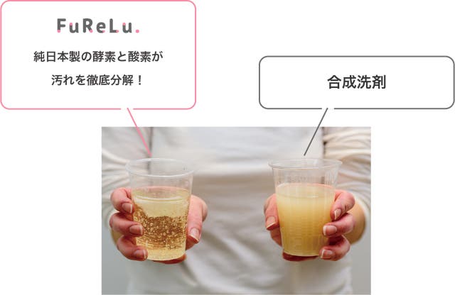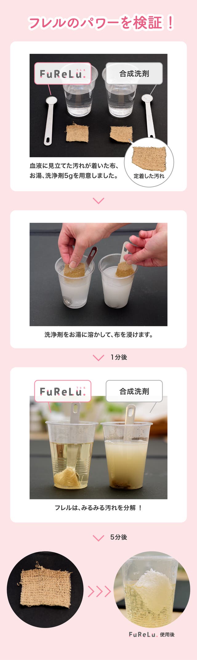 理想の洗剤をなかなか見つけられない日々でしたが、昨年、洗浄剤を取り扱う会社の社長と出会い、この洗浄剤に巡り会いました。石油系成分ゼロで女性にも環境にもやさしく、血液シミも簡単に落ちる、理想的な洗浄剤。この洗浄剤をすべての女性に届けたいと思い、『FuReLu.』が誕生しました。