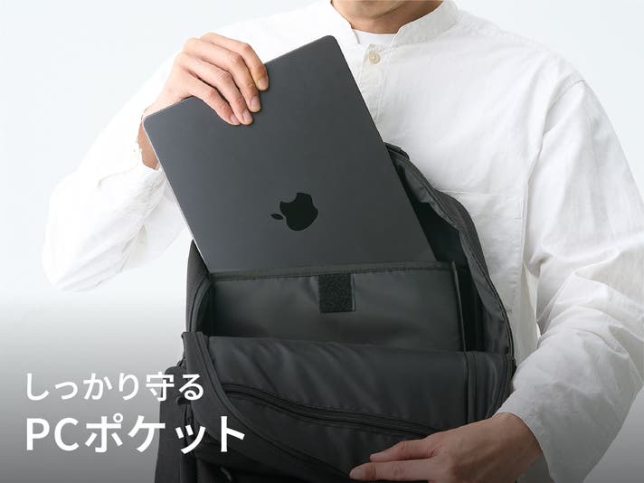 荷室の背中側にはPCポケットを設置。背中側にあるから重量のあるPCでも歩く際に重心がブレにくく快適。不意の飛び出しを防ぐベルト付きです。