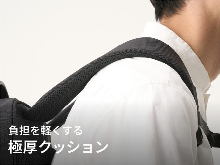ショルダーストラップには厚み約15mmになる極厚クッションを設置。肩にかかる圧力を分散させると同時に、CORDURA®としっかりとした縫製によりタフさも実現しています。