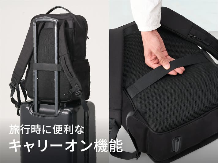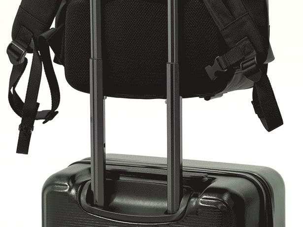 背中面のキャリーオンストラップをキャリーケースのハンドルに差し込めば、安定して持ち運びが可能。こうした細かな機能性にも配慮されています。