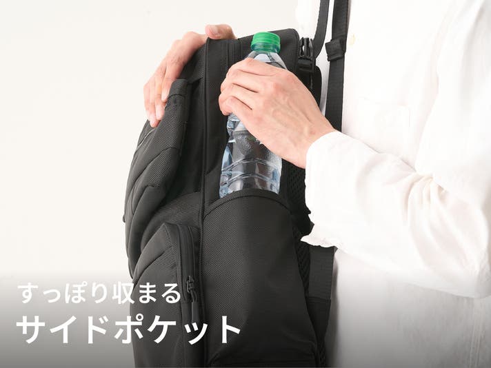 左右側面のサイドポケットは、折り畳み傘などの収納に便利。深型だから、ペットボトルはラベルを見せることなくすっぽりと収まります。