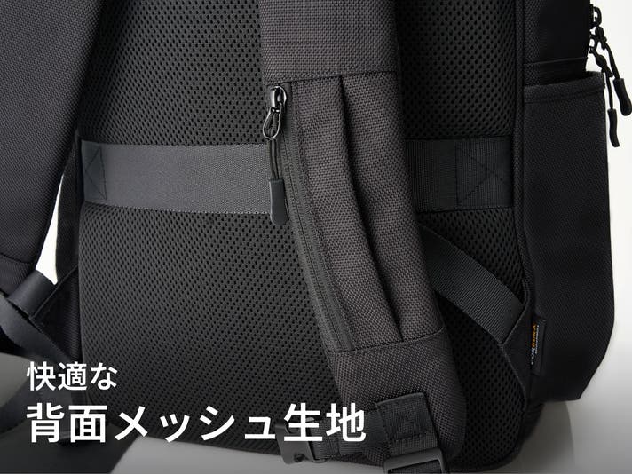 背面には全面的にメッシュをあしらうことで、より快適に。長距離の移動や暑い日の出勤でも空気を通しやすく、ムレを軽減します。