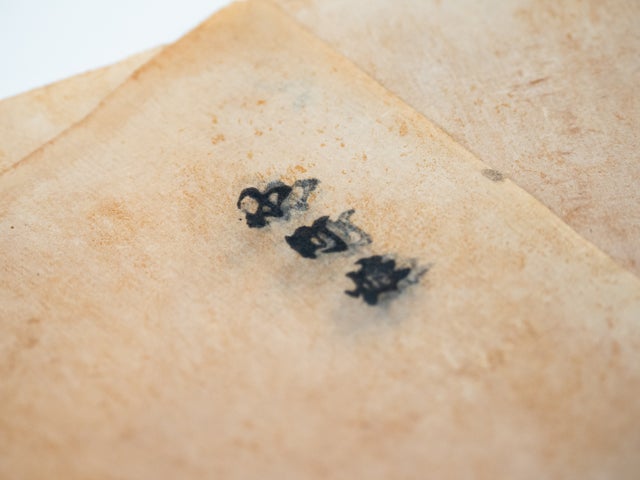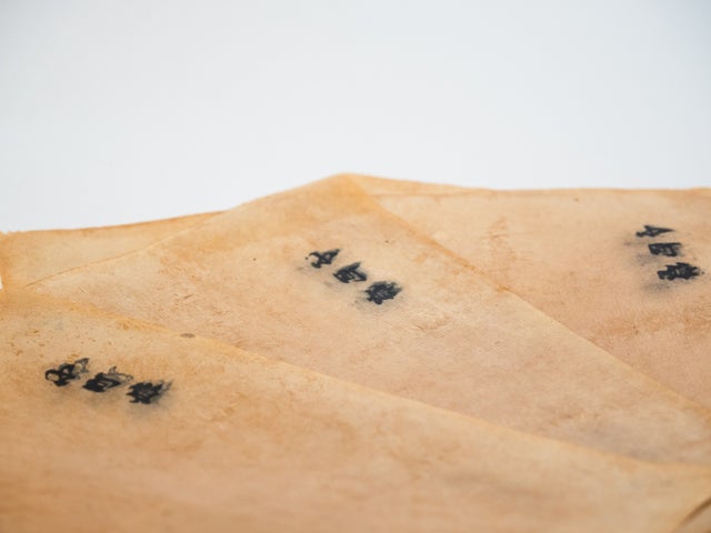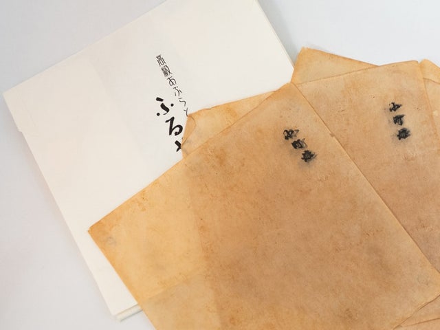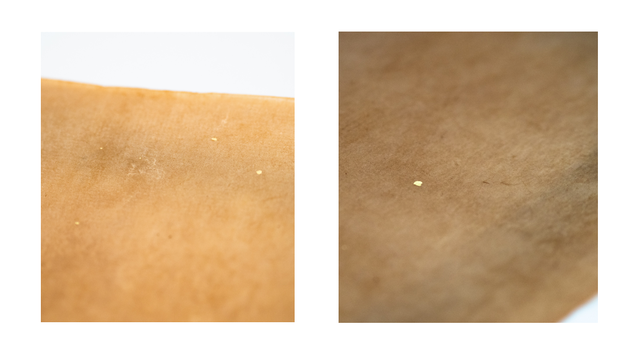 金箔を挟んでいた際の特殊な和紙なので、よく見ると、金箔のかけらが残っていることがあります。実際に箔打ちのために使われていた打ち紙の痕跡です。金箔をより身近に感じることができます!