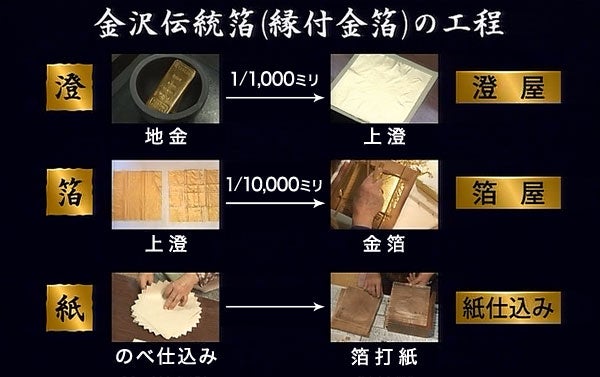 「澄」の工程は、澄屋と呼ばれる職人が担当し、「箔」の工程は箔屋(箔打師) と呼ばれる職人が行います。紙仕込みは、それぞれの工程で用いる紙を製紙業者から購入し、澄屋、箔屋が行います。