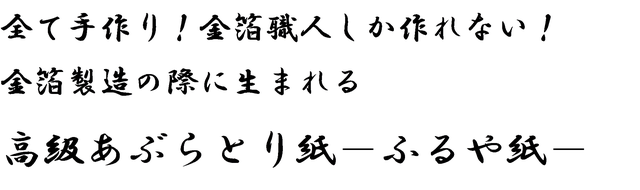 雁皮を主原料とし、灰汁や渋柿で出来ており、何度も繊維を叩くことで高い吸収性があります。金箔の製造に長く使われたものほど吸収性が高く、そのため、使用年数が長いものほど高級とされ、10年以上使い、それ以上使えなくなった箔打紙がふるや紙と呼ばれ、高級なあぶらとり紙となりました。