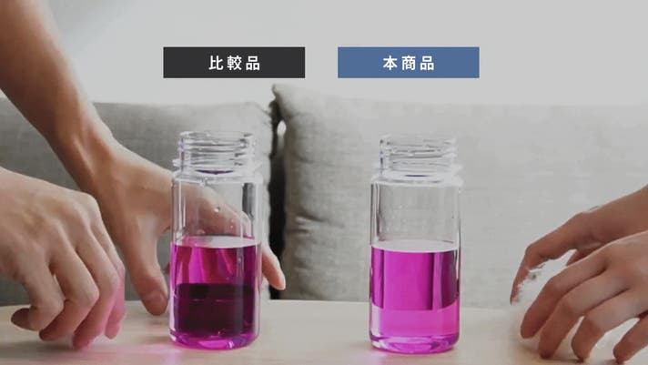 消臭効果を色付きのアンモニアで実験すると、ニオイの成分を中綿が吸収し、無色透明に。毎日使うものだからこそ、気になるニオイにも対応しました。