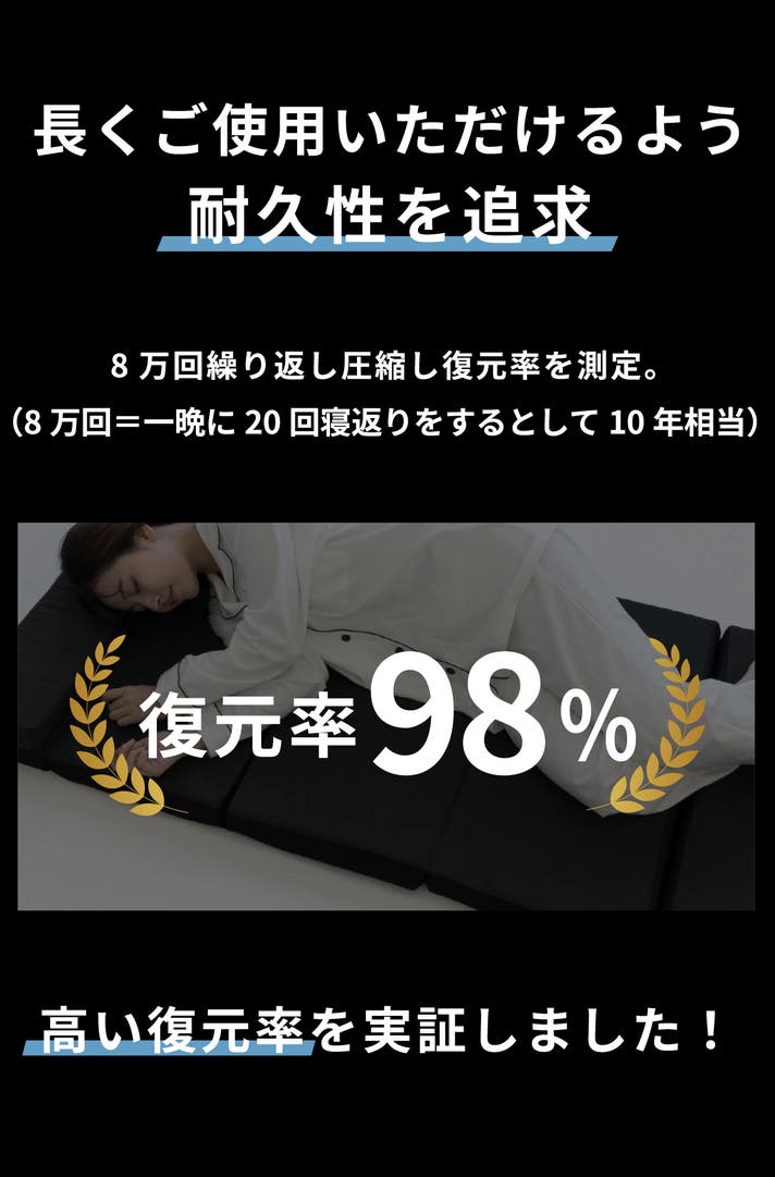 A.一晩に20回寝返りすると仮定して約10年に相当する耐久性試験をクリア(復元率98%)した素材を採用しています。