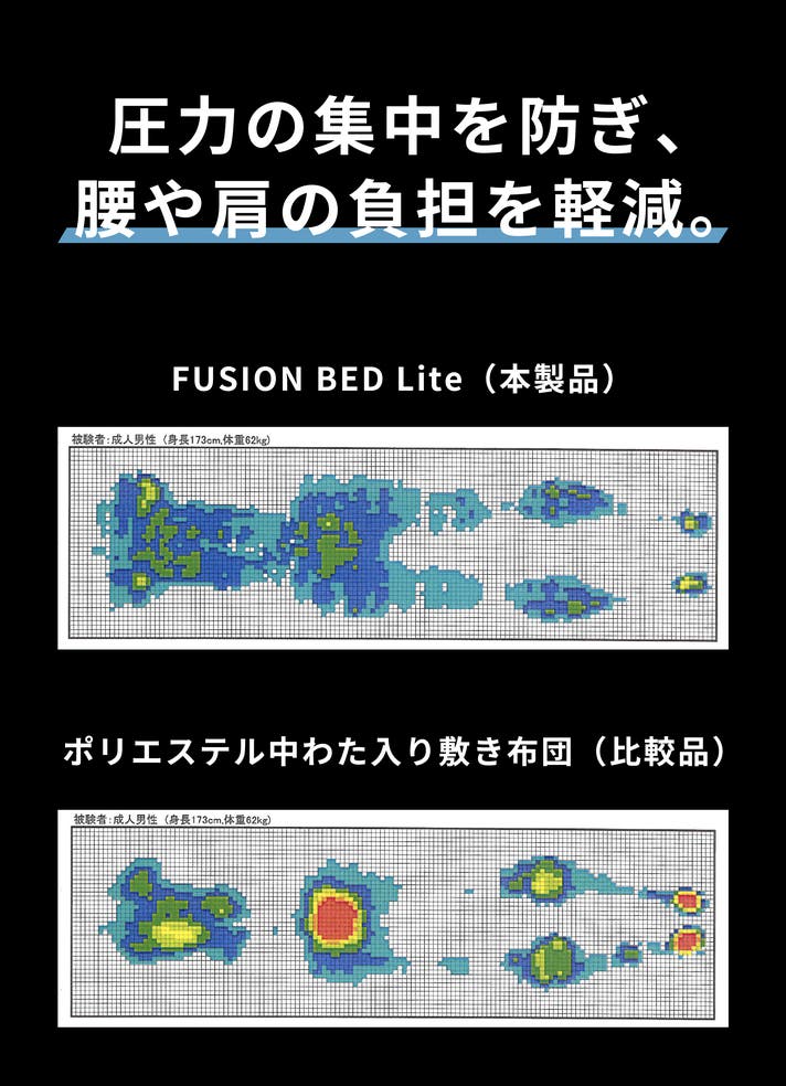 腰への圧力が集中している比較品に対し、FUSION BED Liteは体圧を分散して体への負担を軽減します。