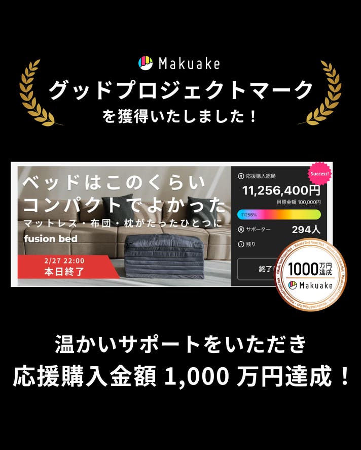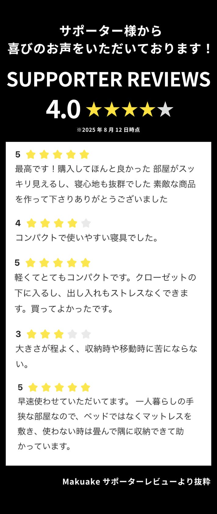 広げれば上質な寝心地、畳めば部屋は一瞬で広く自由に。この新しい選択肢を、多くの方へお届けできたら嬉しいです!