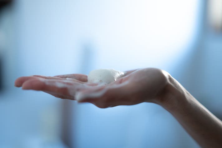 1.手のひらに適量とり、水またはぬるま湯でしかりと泡立てます。(泡立てネット等を使いますと、より一層泡立ちが良くなります。)